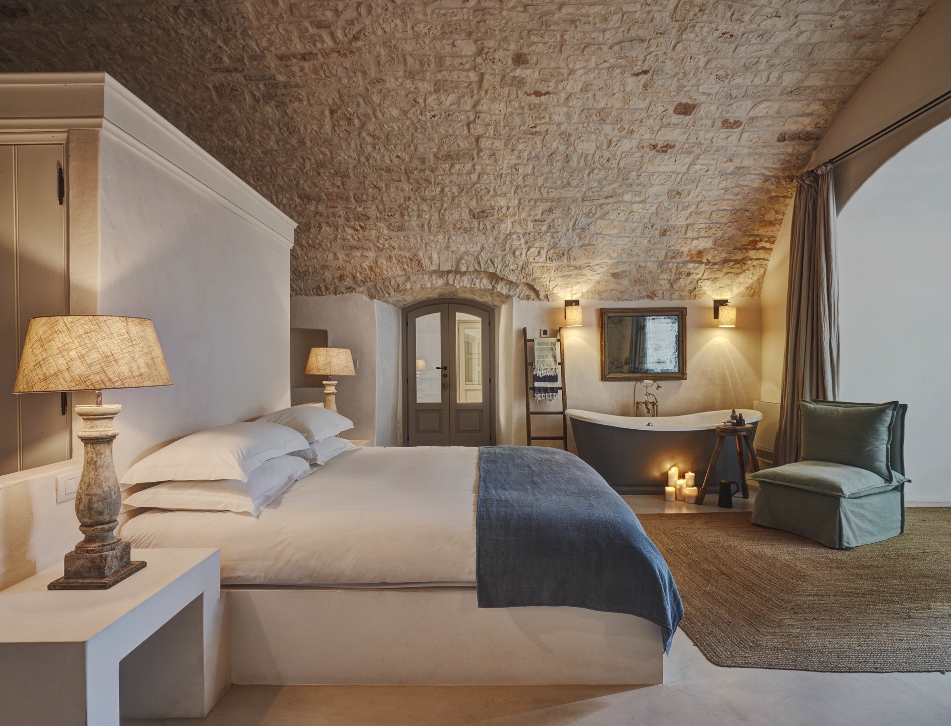 Una romantica suite king size al piano terra con accesso alla suite del Gargano e un ingresso privato all’Hammam.